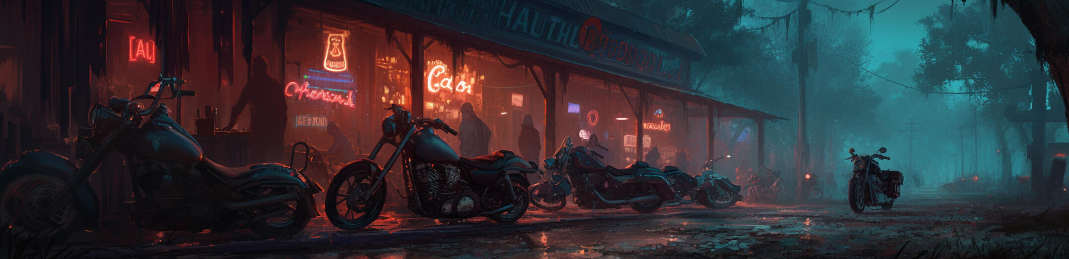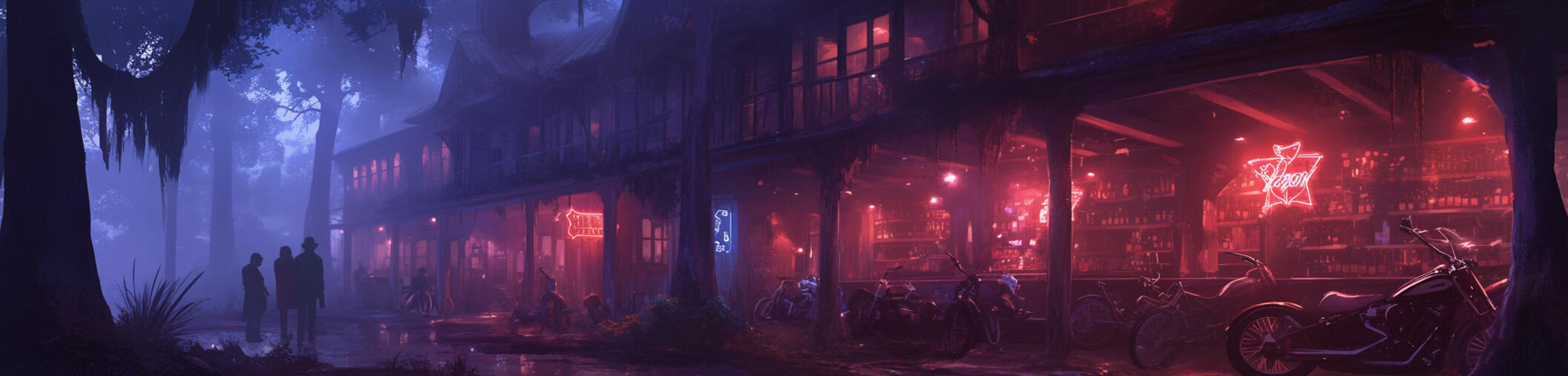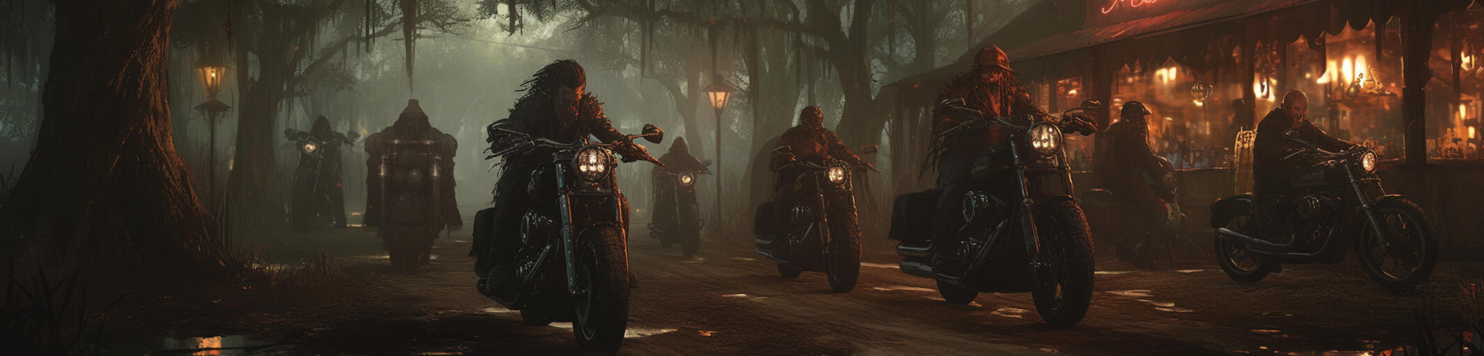 A rotting beast of a building, half-swallowed by swamp and time. The clubhouse squats at the end of a cracked, overgrown road, hidden by leaning cypress and thick curtains of moss. Its bones are old brick and rusted steel, patched together with scrap metal and stubborn rage. A broken neon sign flickers at the front, coughing out the club’s name in fits of dying light. The front row is lined with the bikes of the inner circle, each one scarred by the road and stained by things better left unsaid.No one’s welcomed here. Not unless you bleed for the club—or bleed because of it.