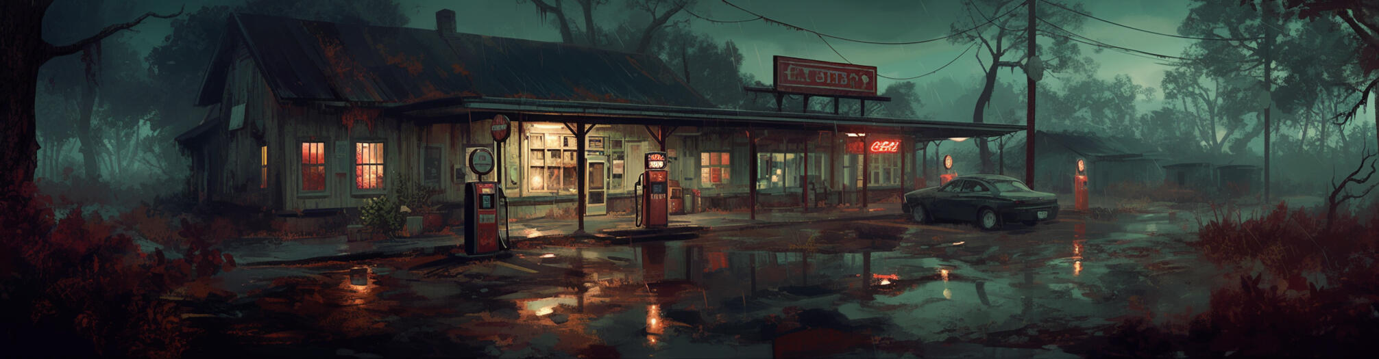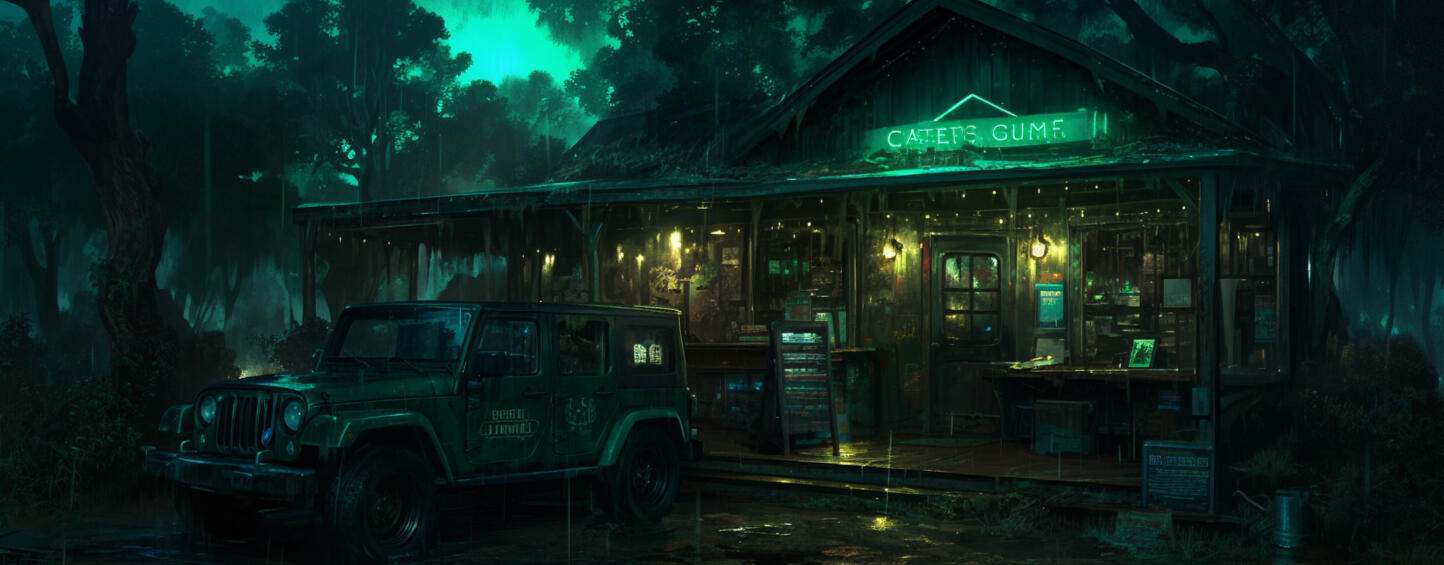 Tucked off the main road, the gas station is a last stop before the long stretch of nothing. The flickering neon sign does little to hide the rust on the pumps, and the cracked asphalt in the parking lot looks like it’s been there longer than anyone can remember. The place isn’t exactly bustling, but there’s always someone hanging around—usually with nowhere to be.Inside, the shelves are stocked with the bare essentials: cheap snacks, dented cans of soup, and a few dusty bottles of water. The smell of stale coffee hangs thick in the air, mingling with the faint scent of gasoline that seeps from the pumps outside. The clerk behind the counter is often dozing off, staring out the cracked window at the empty road, maybe hoping for a car to pull up, or maybe just wishing for something different.The gas station has seen better days, but so has everything in Gator Creek. It’s not much, but it’s enough to keep people from running on fumes, both literally and metaphorically. You can’t say it’s a friendly place—there’s a cool distance between the clerk and the customers, like everyone’s trying to keep their own secrets buried. The only sound, other than the hiss of the pump, is the hum of the fridge in the corner, keeping the beer cold for when someone finally needs a drink.Once the sun starts to set, the place gets even quieter. The lights flicker a little more, and the occasional car that stops seems to carry more dust than life. It’s a pit stop for travelers who don’t plan on sticking around—just enough to fill the tank before they drive on. Because in Gator Creek, nobody stays if they can help it.