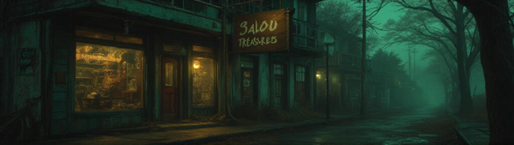 Monty’s shop, "Bayou Treasures," squats between two other weather-worn buildings like it’s always been there - too stubborn to leave, too proud to change. The paint on the front is sun-faded and flaking, the wooden sign hangs at a lazy tilt, and the display windows are streaked with a fine film of bayou dust and swamp grime.Inside, it's a chaotic blend of charm and clutter: overpriced souvenirs crammed onto crowded shelves, faded "authentic" maps, voodoo dolls with uneven eyes, and gator teeth necklaces dangling from hooks. There's a glass case full of mystery items Monty swears are “rare” and “totally not cursed,” and a stuffed raccoon in a Mardi Gras mask watching from the corner.Above it all, Monty lives in a small apartment. Just a few creaky stairs away from the chaos below. He inherited the place from his grandfather, but runs it with the least effort humanly possible. Still, it turns a profit, mostly because no one else in town’s selling voodoo dolls and half-truths with that kind of grin.
