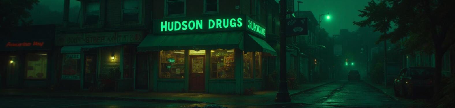 Hudson Drugs stands as another business clinging to existence in Gator's Creek, its faded green awning and flickering neon sign casting a crimson glow against the worn brick facade that has weathered decades of Louisiana storms.Inside, pharmacist William Hudson—third generation in a family business that barely breaks even each month—dispenses medications, folk remedies, and occasionally unsolicited advice from behind a scratched counter that's witnessed countless whispered conversations about ailments folks would rather keep private.The store's ancient bell still announces each customer with a cheerful ding that feels out of place in a building where the fluorescent lights buzz like trapped insects and the shelves hold dusty products that haven't moved since the mill closed, just another struggling establishment in a town where nothing seems to thrive anymore.