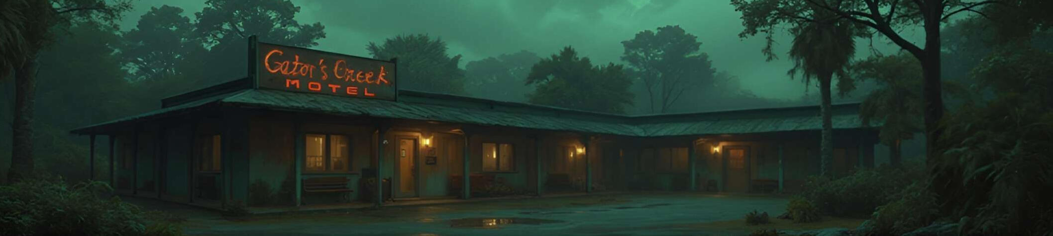 The Gator Creek Motel sits slumped at the far edge of town like it’s trying to forget it ever existed. Ten rooms circle a courtyard choked with weeds and creeping vines, the air thick with mildew and memory. Paint peels like sunburnt skin, and the flickering roadside sign fights a losing battle against the wind, its glow barely more than a ghost’s whisper.Behind the sagging lobby, Laurent Baptiste lives in a studio stuffed with relics—a shrine to what the motel once was. In its former life, it was a haven listed in The Negro Motorist Green Book, a sanctuary for weary Black travelers in a world that didn’t welcome them. Those days are long gone. Now the rooms mostly shelter the broken: barflies who drink too deep at The Copperhead, folks with nowhere left to run, and people trying to vanish without a trace.Laurent stays out of duty, not hope. His grandmother called the land sacred, and he’s kept her wards—charms above doorways, salt under floorboards. The veil here is thin. Some nights, the air hums with spirits who never moved on, and storms roll in without warning, full of rage and memory.The motel ain’t dead. Just waiting.