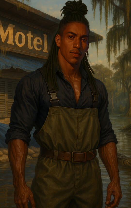 The Gator Creek Motel sits slumped at the far edge of town like it’s trying to forget it ever existed. Ten rooms circle a courtyard choked with weeds and creeping vines, the air thick with mildew and memory. Paint peels like sunburnt skin, and the flickering roadside sign fights a losing battle against the wind, its glow barely more than a ghost’s whisper.Behind the sagging lobby, Laurent Baptiste lives in a studio stuffed with relics—a shrine to what the motel once was. In its former life, it was a haven listed in The Negro Motorist Green Book, a sanctuary for weary Black travelers in a world that didn’t welcome them. Those days are long gone. Now the rooms mostly shelter the broken: barflies who drink too deep at The Copperhead, folks with nowhere left to run, and people trying to vanish without a trace.Laurent stays out of duty, not hope. His grandmother called the land sacred, and he’s kept her wards—charms above doorways, salt under floorboards. The veil here is thin. Some nights, the air hums with spirits who never moved on, and storms roll in without warning, full of rage and memory.The motel ain’t dead. Just waiting.